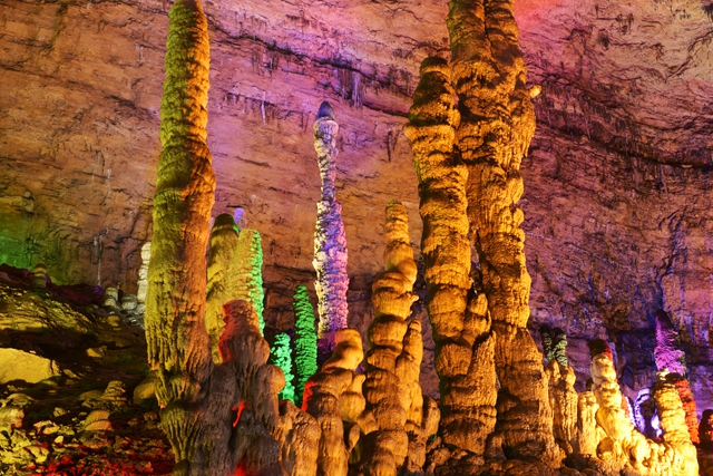黄龙洞以其高阔的洞天、幽深的暗河、密集的石笋而出名。洞中众多的石乳、石柱等各种钟乳石,在灯光的照耀下,多姿多彩。特别是标志性景点“定海神针”,高达20米的钟乳石柱,最细处直径只有10厘米。