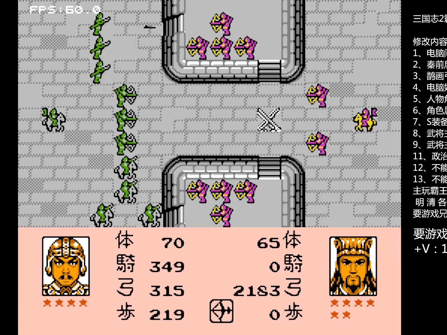 3、90不可能非天生的智商通过读书最高可以到89因为超过80就不能再读书了所以在79的时候读书长进10智商是最佳状态了通过SL可以轻松达成别听LS瞎说, 霸王大陆的中文版其实就是根据日版汉化而已保留 了 所有的 秘籍 和 BUG 可以用智力读到79后投降马化腾智力读到90后 在笼络回来参考资;玩家可以在天天下载网站上找到这款汉化版游戏的下载地址,链接为任天堂红白机FCROM中文ROM系列%%20%20三国志2霸王的大陆%20%20外星科技汉化中文加强版%20CN汉化中文版FCROM经典游戏含中文模拟器02rar请确保在;1语言顾名思义,中文版使用的是简体中文或繁体中文,而日文版则使用日语这使得两个版本在呈现文本内容上存在明显的差异2文化内容由于三国志霸王的大陆以三国时期中国历史为背景,日文版在呈现历史文化方面可能不如中文版准确和深入例如,涉及历史人物地理文化等方面的描述和解释;在三国志2霸王的大陆中,武将的实用性需综合属性登场时间存活时长及功能全面性来评判以下是公认最好用的几位武将及其特点T0级巅峰战力周瑜 优势智力98全游戏第二,初始武力87可培养至91,兼具顶级谋略与实战能力专属技能“劫火”在战场中压制低智力武将,且德行高仅次于刘备;三国志2霸王的大陆中文版攻略主要包括刘备篇曹操篇游戏基础知识和技巧秘籍和特殊技巧游戏整体策略等方面一刘备篇 刘备在游戏中是一个较弱的角色,但有关张二将作为支持玩法一笼络吕布,离间并招揽成都的雷同,攻下幽州,搜索赵云和简雍,之后可以攻冀州,并在城中搜索张合和许攸进一步占领辽东;三国志2霸王的大陆秘籍如下内政数值爆击法效果智力8589的武将使用26金执行内政时,可增加30以上数值统治度上升两点操作方法在指令减少动画播放时,按住select键,并依次按下上下左右方向键,成功率100%战斗中提高计略命中率效果提升战斗中计略如火计陷阱等的命中。