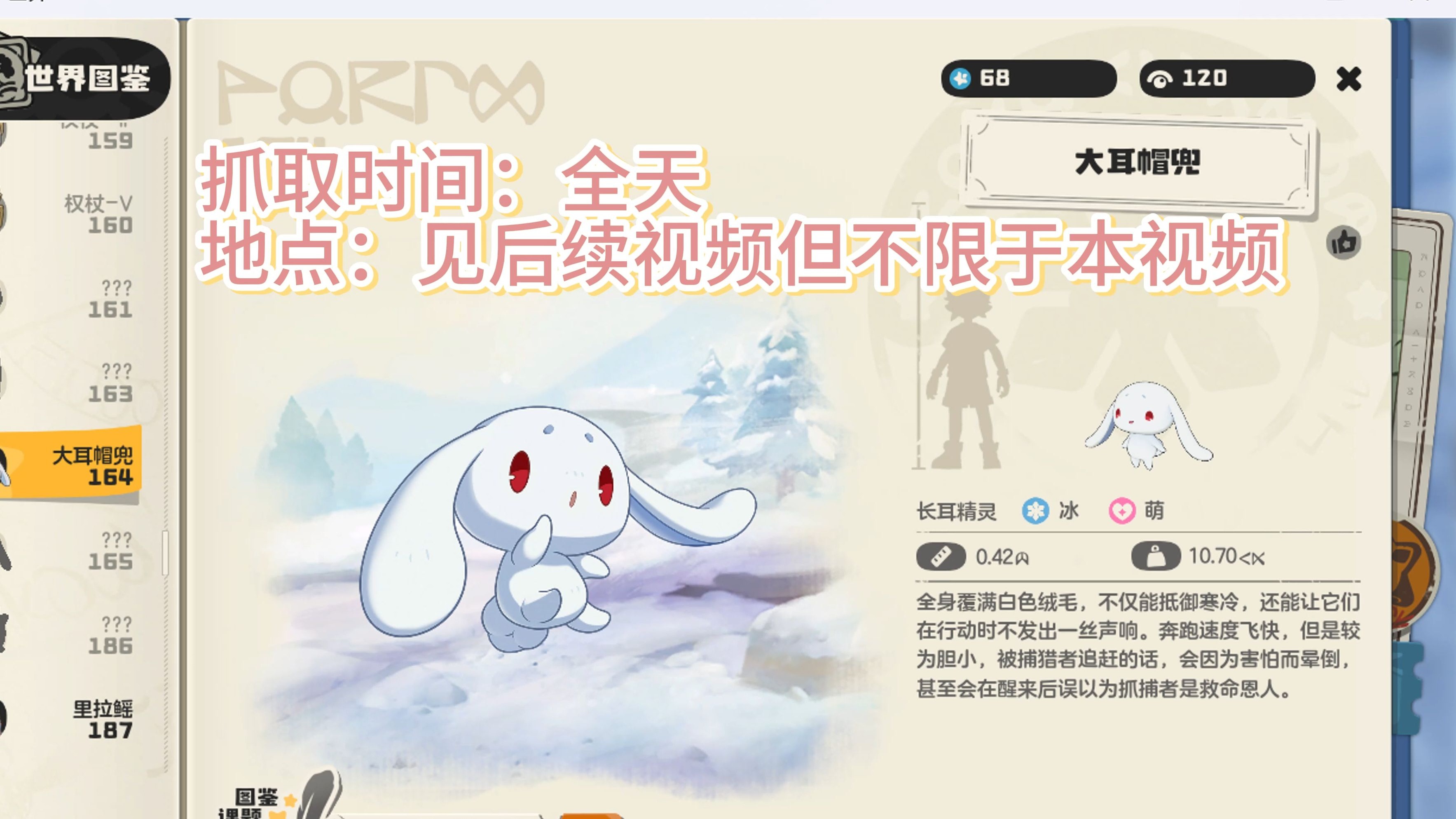 出现时间与地点在4月22日 5月12日期间,每天下午1400 1800,大耳帽兜会在晶晶雪域刷新捕捉方法到达晶晶雪域后多刷几只怪,大耳帽兜就有可能出现捕捉时,建议使用草系宠物,采用催眠粉+寄生种子的组合技能尽量先使用寄生种子再使用催眠粉,这样比较容易控制大耳帽兜的。