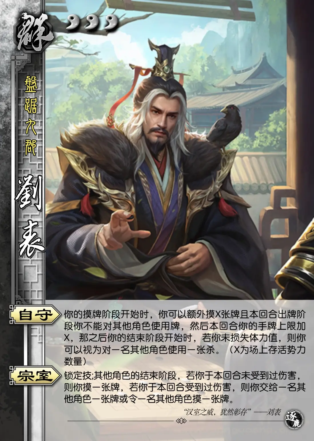 三国杀刘表武将解析一技能解析 自守在摸牌阶段,若刘表已受伤,可以额外摸取等同于已损失体力值的牌,但随后需跳过出牌阶段这一技能让刘表在受伤后能够囤积大量手牌,为后期的爆发做准备宗室锁定技,场上每有一个势力,刘表的手牌上限便增加1这一技能进一步增强了刘表的囤牌能力,尤其是在。